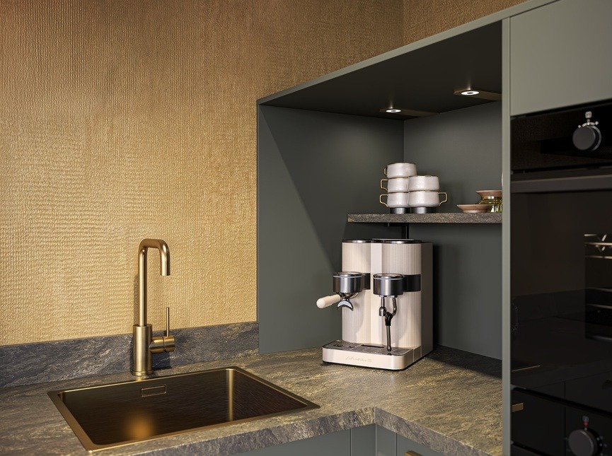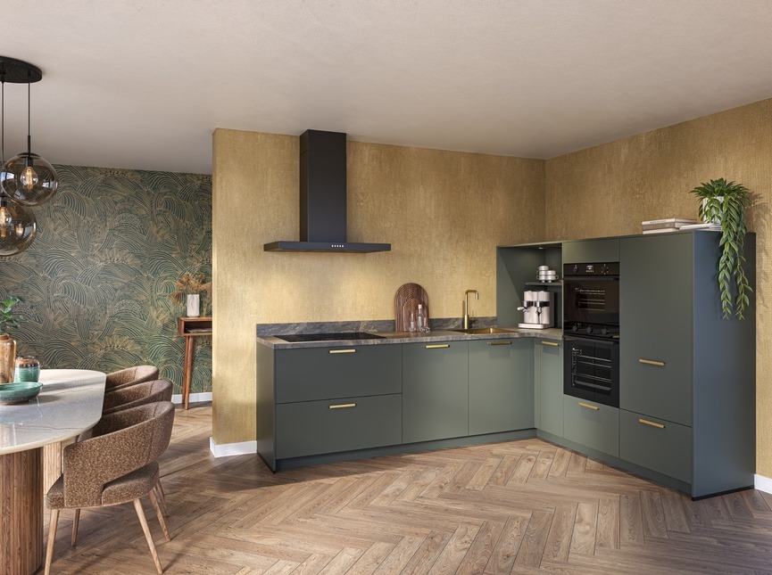 De Easytoledo Mineraalgroen is een moderne hoekkeuken waarin rust en luxe perfect samenkomen. De mineraalgroene fronten geven de keuken een frisse en tijdloze uitstraling en zijn al jaren geliefd in uiteenlopende interieurs. De gouden accenten, zoals de grepen, spoelbak, kraan en verlichting, zorgen voor een warme en chique finishing touch. Zo creëer je een keuken met karakter, zonder concessies te doen aan betaalbaarheid of gebruiksgemak. Dankzij de strakke vormgeving en praktische indeling is deze keuken geschikt voor elke ruimte en in iedere gewenste opstelling te realiseren.