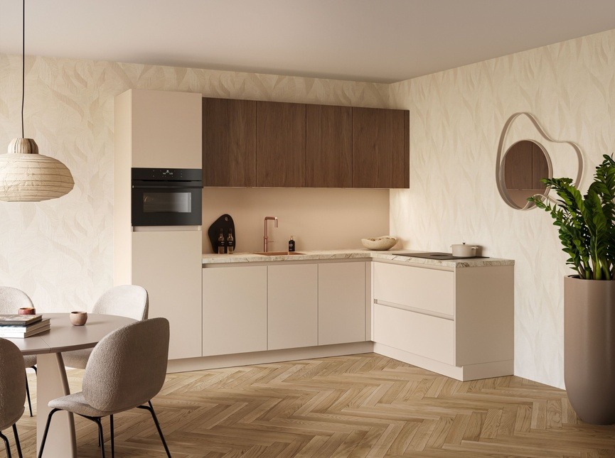 De Elias – Ittenbach keuken staat voor moderne elegantie met een warme, natuurlijke twist. De zachte leemkleur vormt een rustige basis en combineert prachtig met de eikenhouten bovenkasten en de verfijnde koperaccenten in Ittenbach-stijl. Dit samenspel van kleuren en materialen zorgt voor een uitnodigende sfeer waarin je je direct thuis voelt. Het topcore werkblad geeft de keuken een luxe uitstraling, terwijl de slimme hoekopstelling zorgt voor optimaal gebruik van werk- en opbergruimte. Een doordacht ontwerp dat comfort en stijl moeiteloos samenbrengt.