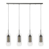 Deze hanglamp heeft vier mondgeblazen glazen kappen. Binnen deze kappen zitten vier cilindervormige mesh kappen verwerkt. De combinatie van het glas en het mesh geeft een industriële look. Daarnaast wordt door deze combinatie het licht mooi gedoseerd door de ruimte verdeeld. Iedere kap is afzonderlijk in hoogte verstelbaar tot 150 cm.