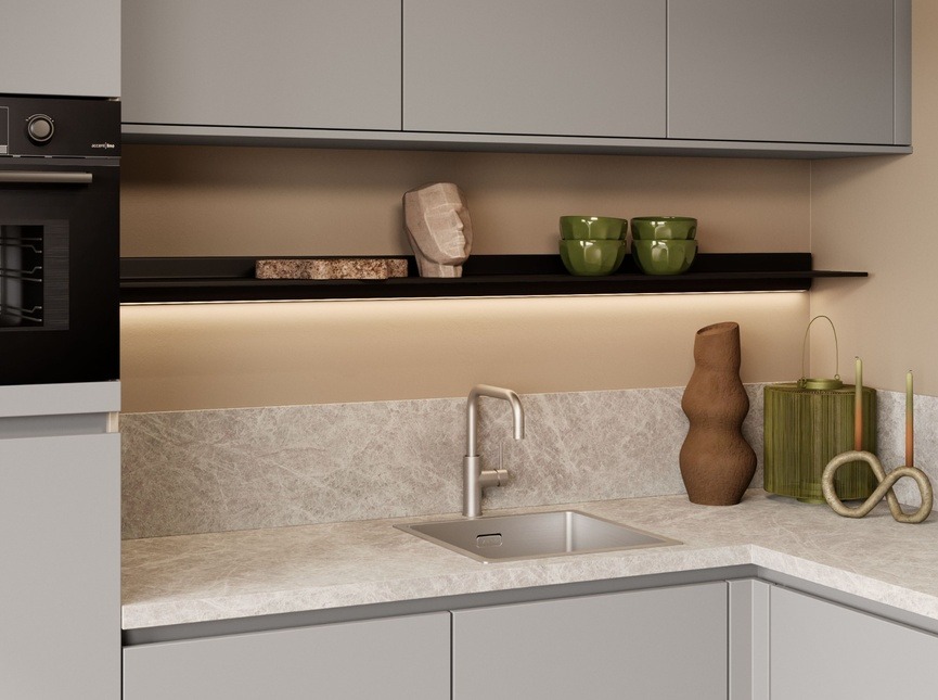 De Puccini Plus keuken in kiezelgrijs is een veilige én stijlvolle keuze voor elk interieur. De tijdloze grijstint laat zich moeiteloos combineren met verschillende woonstijlen en zorgt voor een rustige, moderne uitstraling. De wandplank met geïntegreerde verlichting geeft de keuken een speels en eigentijds accent. Dankzij de slimme hoekopstelling wordt de beschikbare ruimte optimaal benut, wat deze keuken niet alleen mooi maakt, maar ook bijzonder praktisch in dagelijks gebruik.