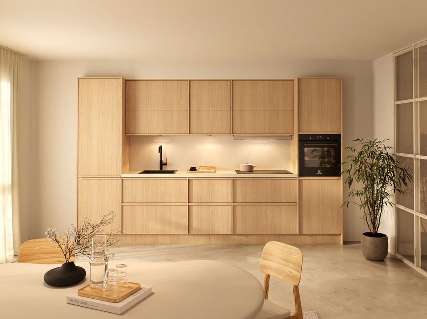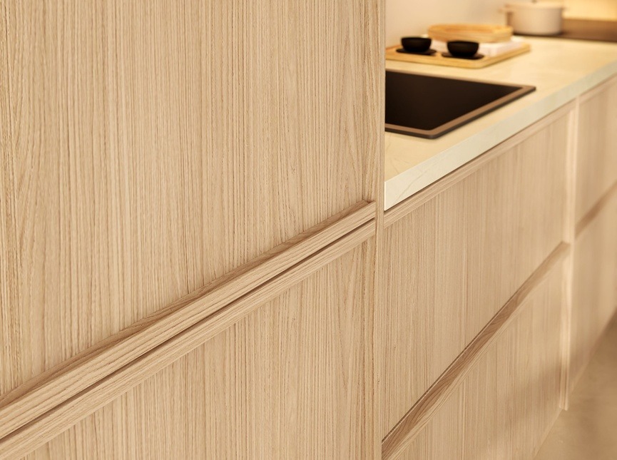De Stanford keuken in eiken como brengt rust, licht en warmte samen in een tijdloos Japandi ontwerp. Het zachte houtdecor zorgt voor een natuurlijke en serene uitstraling, terwijl de strakke lijnen het geheel een moderne balans geven. De kenmerkende panelen tussen de kasten versterken het minimalistische karakter en geven deze keuken zijn verfijnde Japandi look. Een harmonieuze keuken waarin eenvoud, functionaliteit en natuurlijke materialen samenkomen tot een stijlvol geheel dat jarenlang mooi blijft.